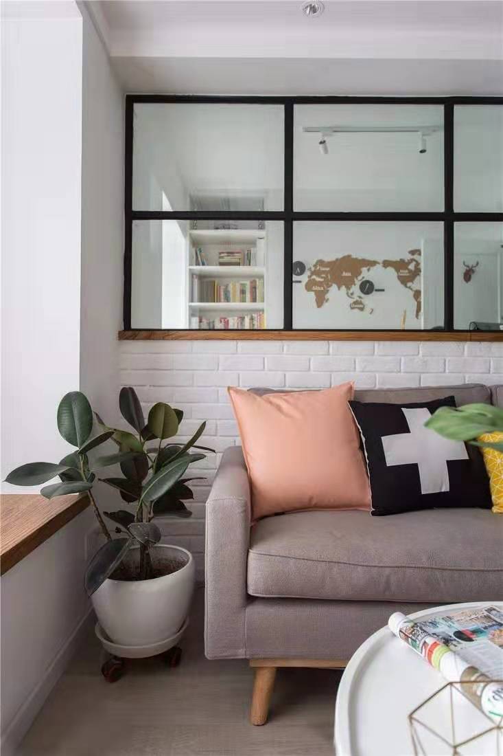 客廳,設計師采用黑框玻璃的設計,在增加整個空間通透感的同時,又可提升書房的采光。