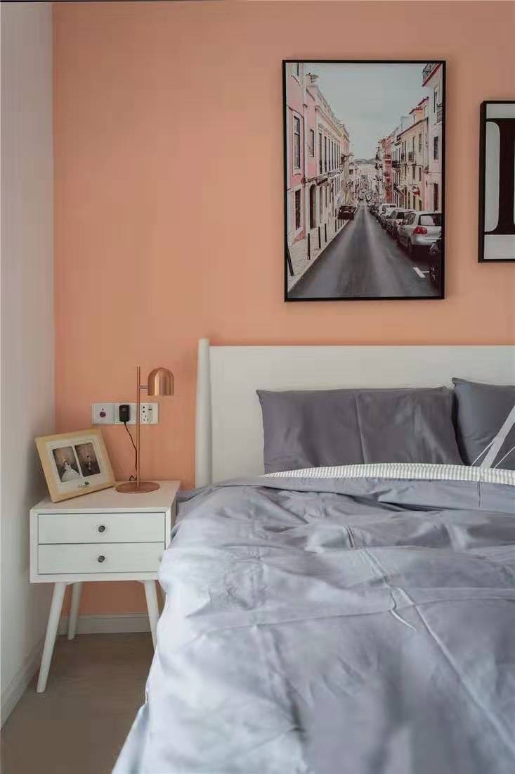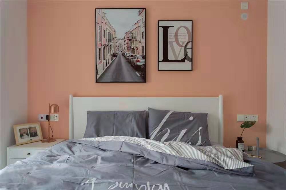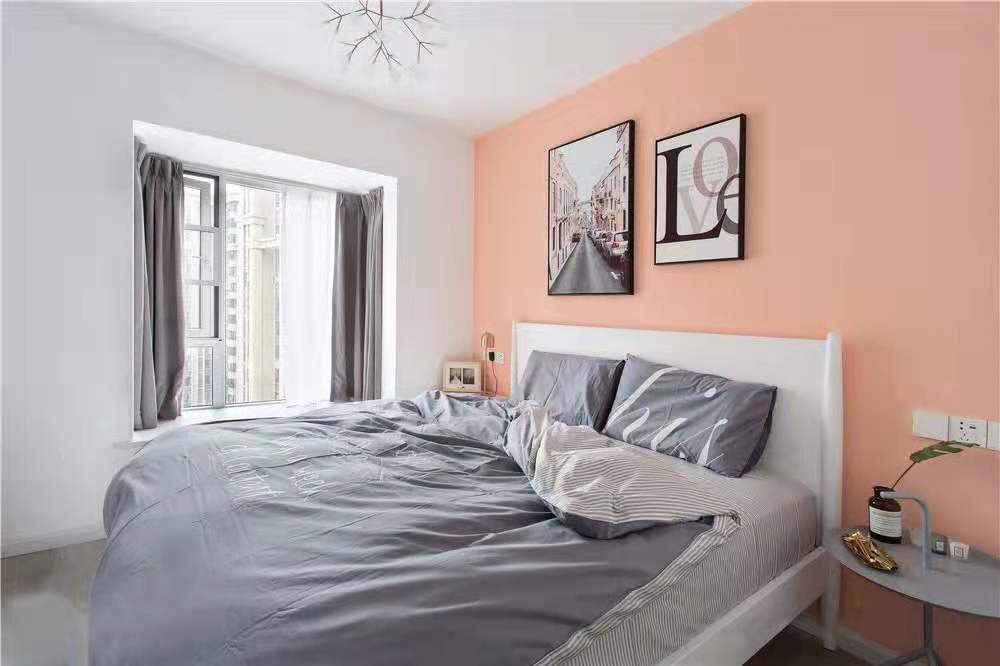 為提高臥室的舒適感,設計師將女主人喜歡的粉色色度調灰,采用灰色窗簾、家具,讓整體色調搭配達到一致。