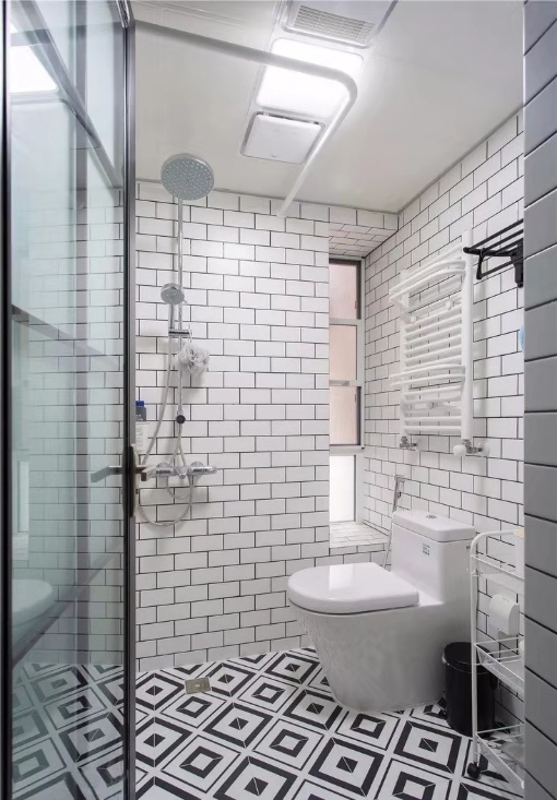 衛生間干濕分區,大大提高了效率。大面積使用黑白灰,墻面以面包磚排列,使得干區洗漱間顯得干凈整潔。