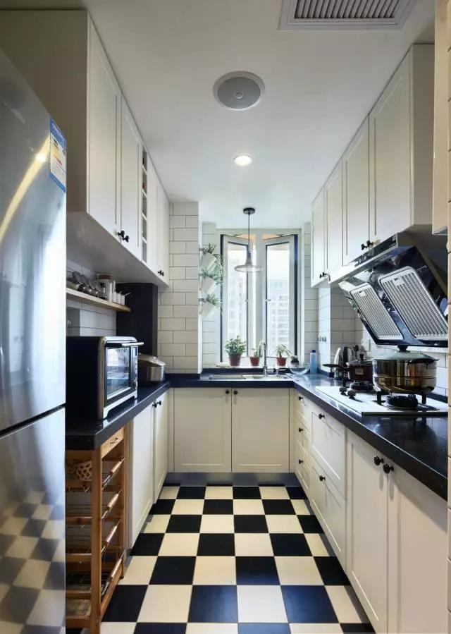 工字鋪貼的小白磚和黑白相間的地磚搭配出一個時尚大氣的廚房,對于大部分選擇簡約風的業主來說,這樣搭配就夠了。